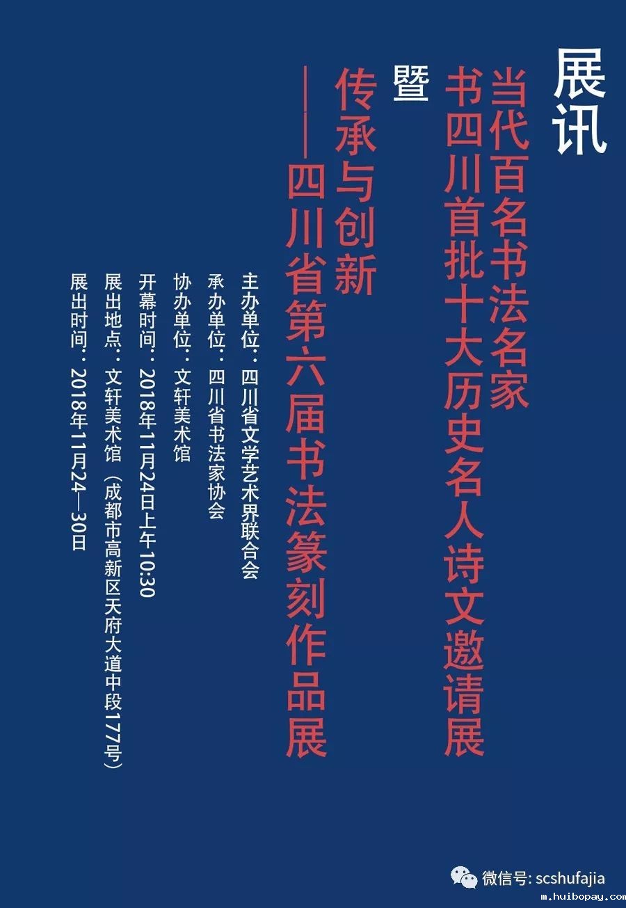 【展讯】2018年11月24日上午10:30,由四川省文学艺术界联合会主办、四川省书法家协会承办、文轩美术馆协办的“当代百名书法名家书四川首批十大历史名人诗文邀请展”暨“传承与创新——四川省第六届书法篆刻作品展”将在文轩美术馆举行开幕式,欢迎参展作者、我省广大书法家、书法爱好者届时前往观展、学习。