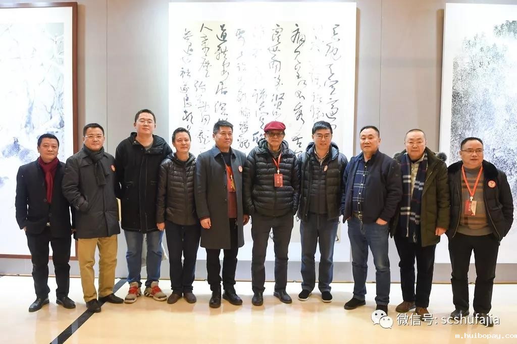 徐世群 杨邦杰 陈杰 蔡竞 郑晓幸 何天谷 朱丹枫 蔡达林共同启动按钮为“山水清音•天府高峰—天府书画名家作品联展”启幕