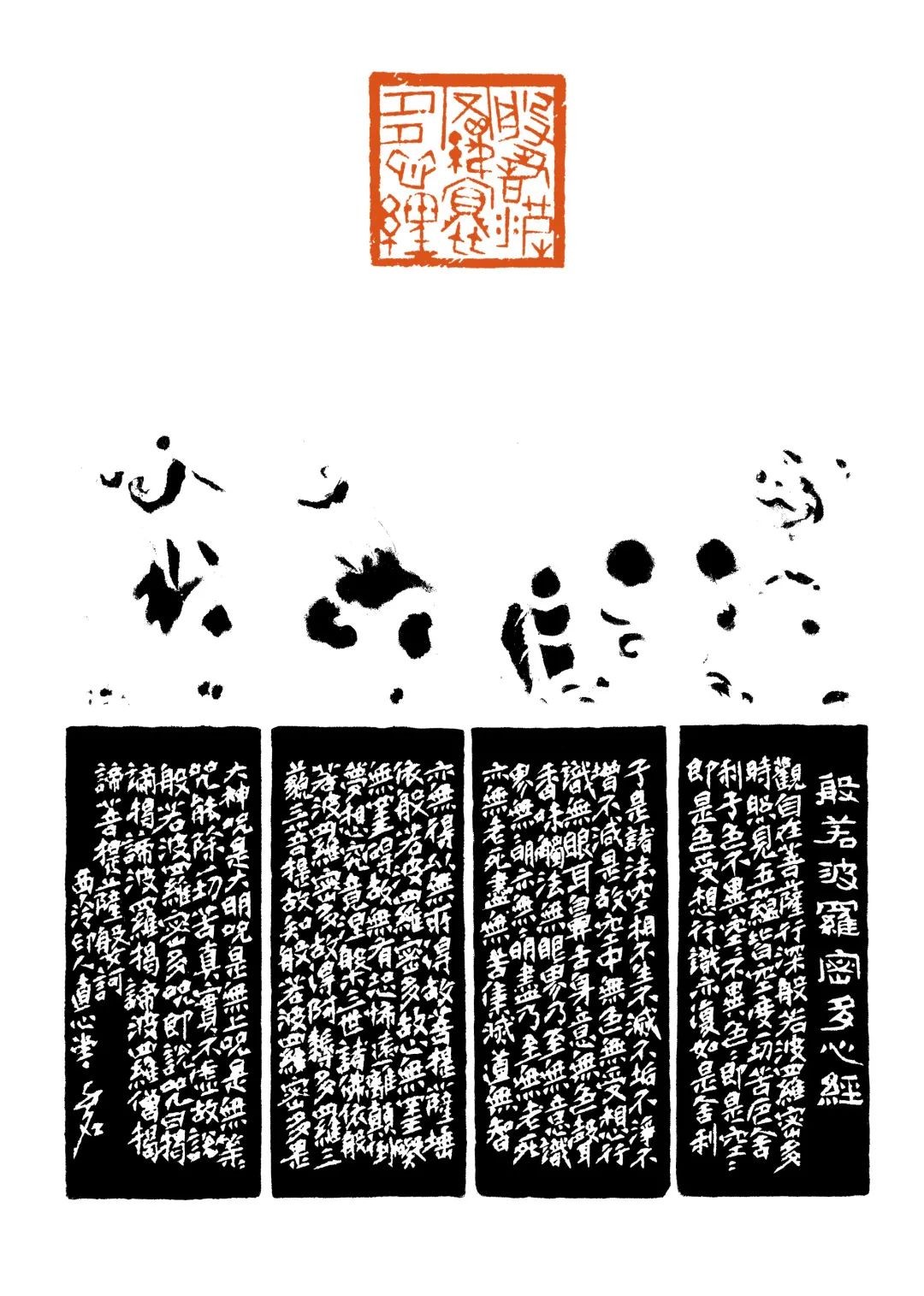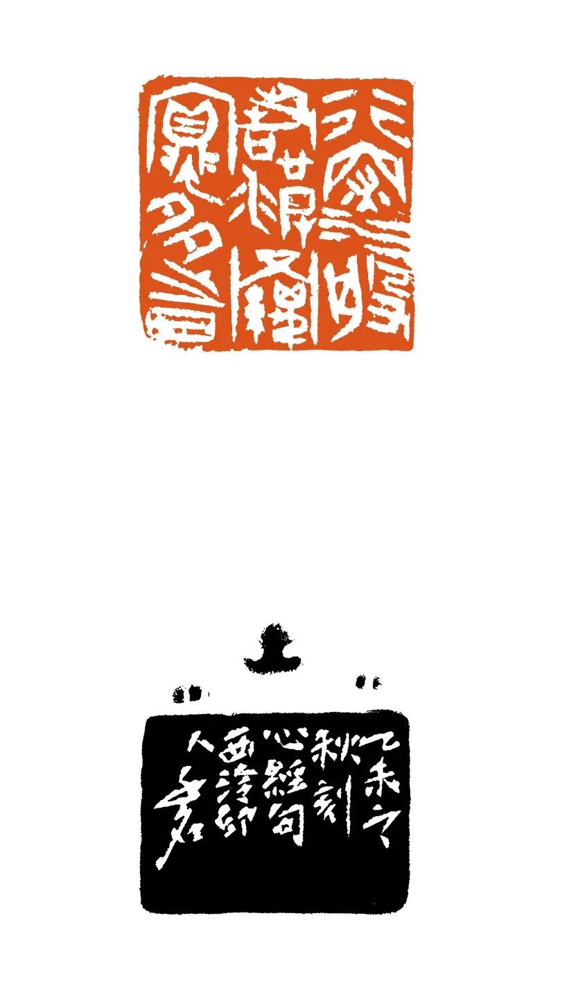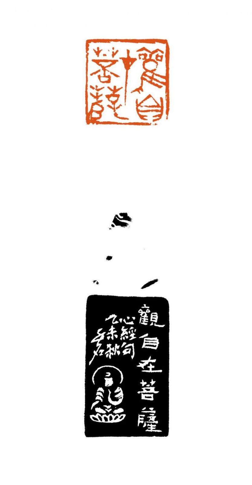 譬如作品集中首枚朱文印“般若波罗蜜多心经”。“般若”二字斜线的律动变化;“波”字水的四个点,与左边“经”的三个点相呼相应;以及“罗”字结构中的“纟”,其状不仅与左下、右下的点成三角形引势关联,而且其份量有如定音鼓的一记强音,敲在了整个作品节律的黄金分割点位。由此也铺开了《心经》全套54方印的序曲——宏大、温婉、多变、生生不息。