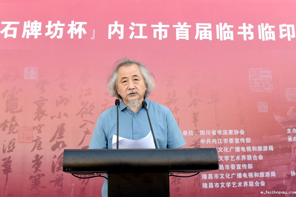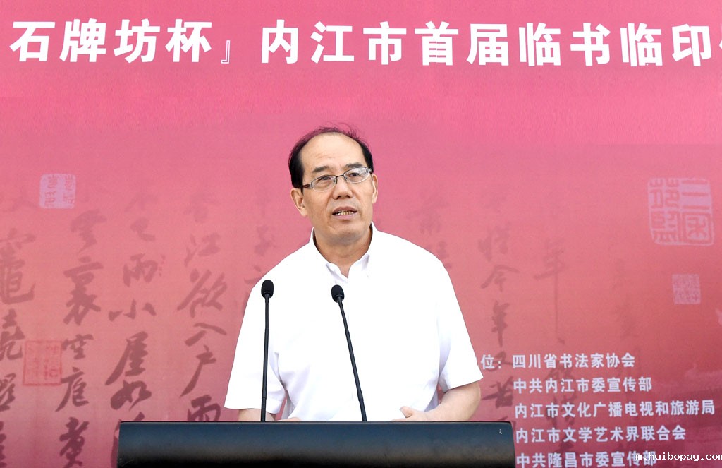 刘强代表隆昌市委市政府向出席开幕式的客位领导、书法家,来宾朋友们表示热烈的欢迎和诚挚的问候!他说,隆昌是中国石牌坊之乡,现存石牌坊共17座,每座牌坊上面都雕刻着栩栩如生的人物、花乌,动植物等图案,图案造型讲究,雕工精美,无论是功德牌坊、警示牌坊,节孝牌坊还是百寿牌坊,在修造,雕刻,篆写文笔等方面都极其讲究,牌坊上写的文字,图案顾具深刻的思想内涵、高深的文化和生活哲理,这次举办“石牌坊杯内江市首届临书临市作品展”,通书法艺术形式对牌坊文化的肯定和宣传,是对优秀传统文化艺术进行深入研究、发掘、借鉴和化取,也是提升当代书法篆刻创作水平的重要途径,必将推动内江书法篆刻艺术传承与发展,也将进一步步擦亮隆昌牌坊文化名片。