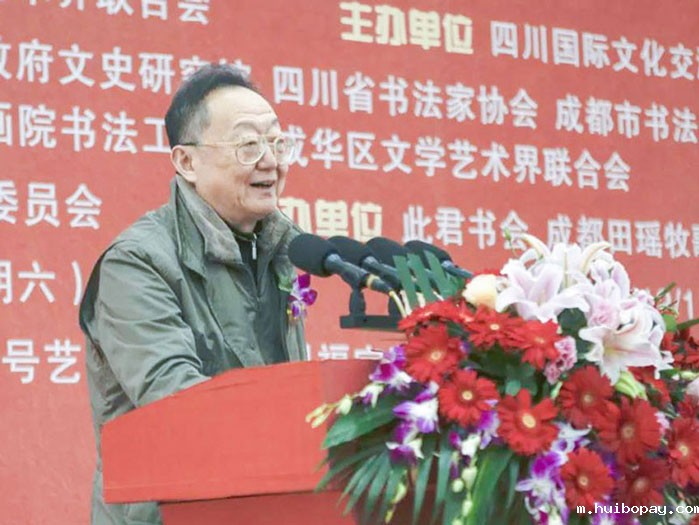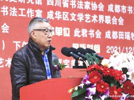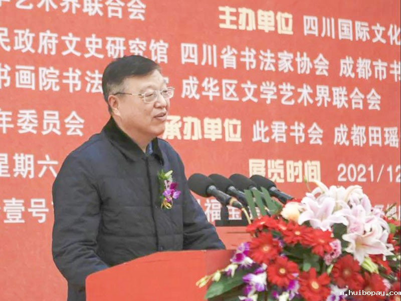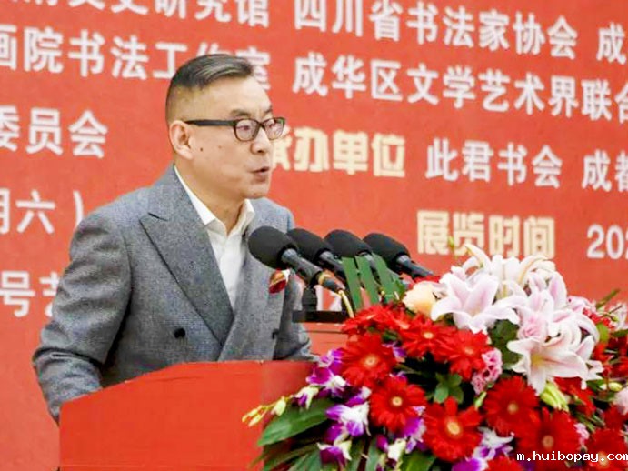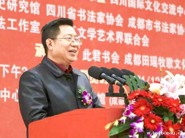 成都电视台主持人陈笛主持开幕式并代表中国书法家协会副主席、四川省书法家协会主席、四川国际文化交流中心理事戴跃送上贺词。