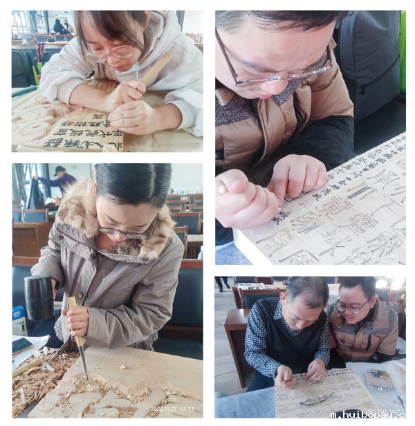 郎超在授课中,讲解理论简明扼要,操作示范,身体力行。对学员有问必答,有难立解,手把手相授技艺,尤其是在起稿环节,既为学员提供丰富的刻字优秀作品参考,又耐心启发学员,详解如何规划布局,每天辅导学员达十二小时以上,有时为指导学员废寝忘食,临别内江上高铁一小时前还在为学员作品辅导上色。老师垂范,学员们学习热情高,当能基本完成一件刻字作品受到老师肯定和表扬时,都有一种说不出的自豪与兴奋。