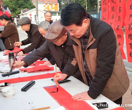 展览活动现场,广大书法家们还为市民免费写春联200余幅,赠送“福”字300多幅。县委组织部常务副部长、县委老干部局局长朱敏育、县委宣传部常务副部长雷宇、县委宣传部副部长严玉亲自参观展览并向骑龙镇、狮市镇、富世街道沙山社区和江阳磁材公司等六个单位赠送春联和“福”字作品300多幅。