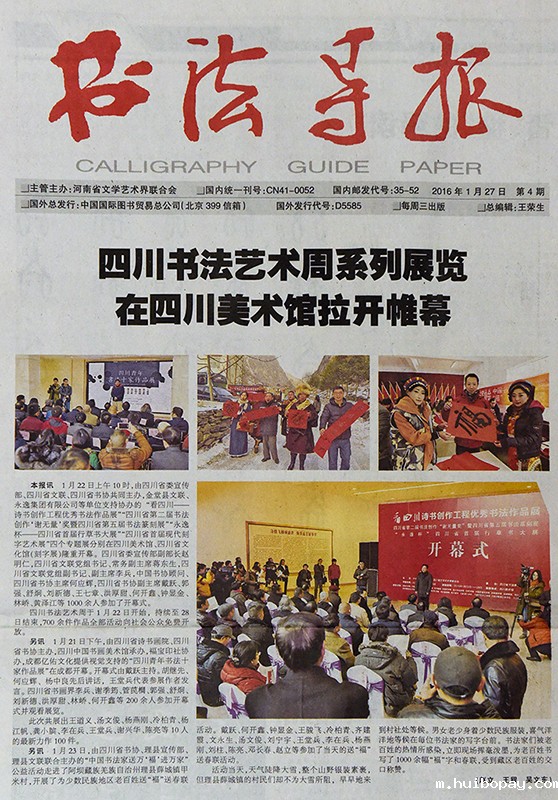 米兰足球彩票官网讯 1月 22日,四川书坛近年来规模最大的一次综合展览在四川美术馆、四川省文化馆(刻字展)隆重开启帷幕以来,《看四川——诗书创作工程优秀书法作品展》、《四川省第二届书法创作“谢无量”奖暨四川省第五届书法篆刻展》、《永逸杯——四川省首届行草书大展》、《四川省首届现代刻字艺术展》四个专题展,《四川青年书法十家展》以及四川省书协开展的赴阿坝羌族自治州理县甲米村开展“中国书法家送万‘褔’进万家”公益活动在四川书法艺术周期间陆续展开,丰富的书法活动吸引了川内外大量书法爱好者前往参观、参与, 1月27日,《书法导报》在头版头条对四川书法艺术周的一系列活动进行了全方位、大篇幅宣传报道,引起强烈反响,获得广泛好评。