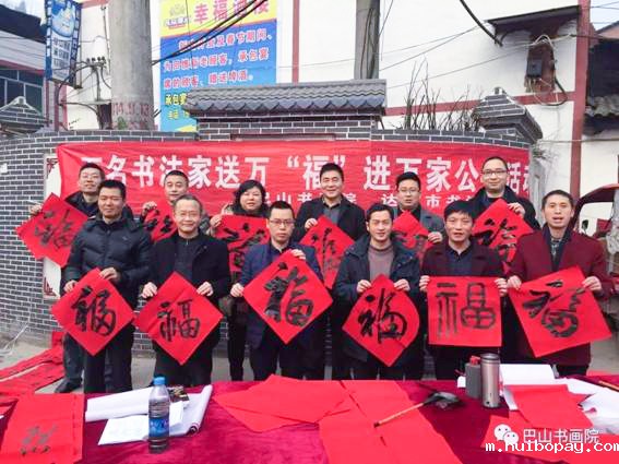 达州市书法家协会主席、巴山书画院院长马骏华,达州市书法家协会副主席、巴山书画院创作部主任凌灿印、巴山书画院展陈部主任陈明,书法家冯圣城、谭伟、何三辉、付国、绕德模、吴树、常辉、李松远、张林、冯必胜、罗宇14人组成的送“福”队伍走进大竹县二郎乡为百姓送出“福”、春联及书法作品800余件。