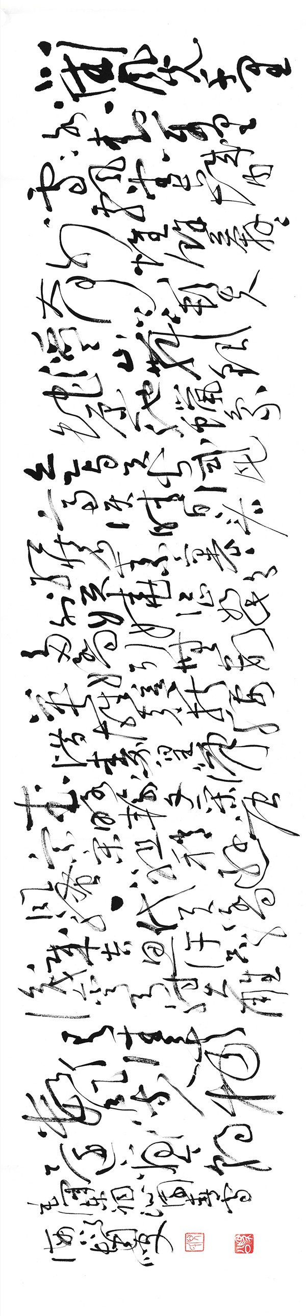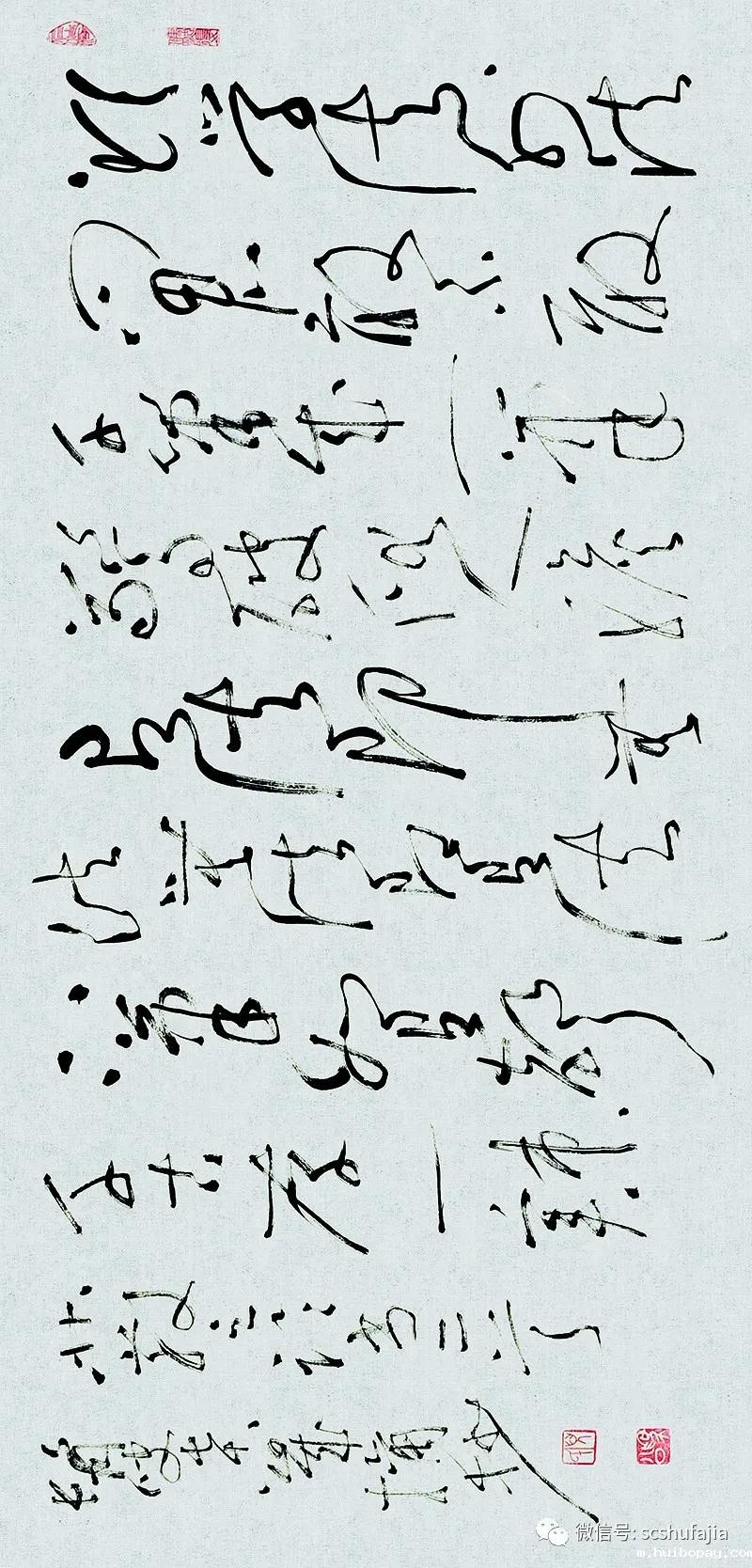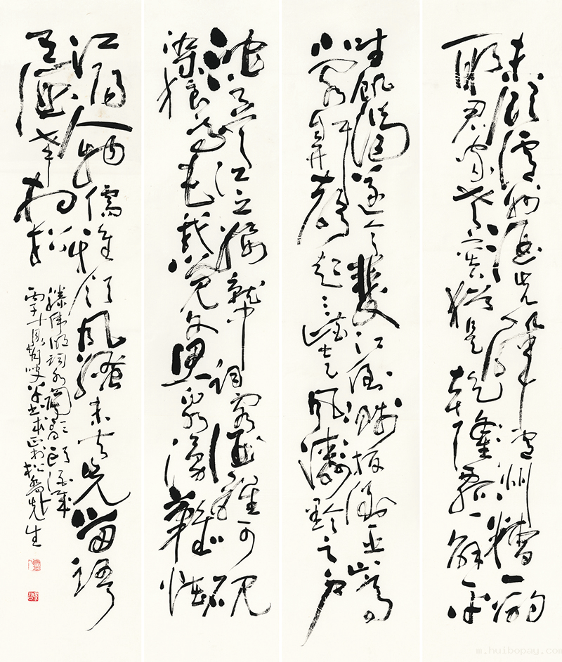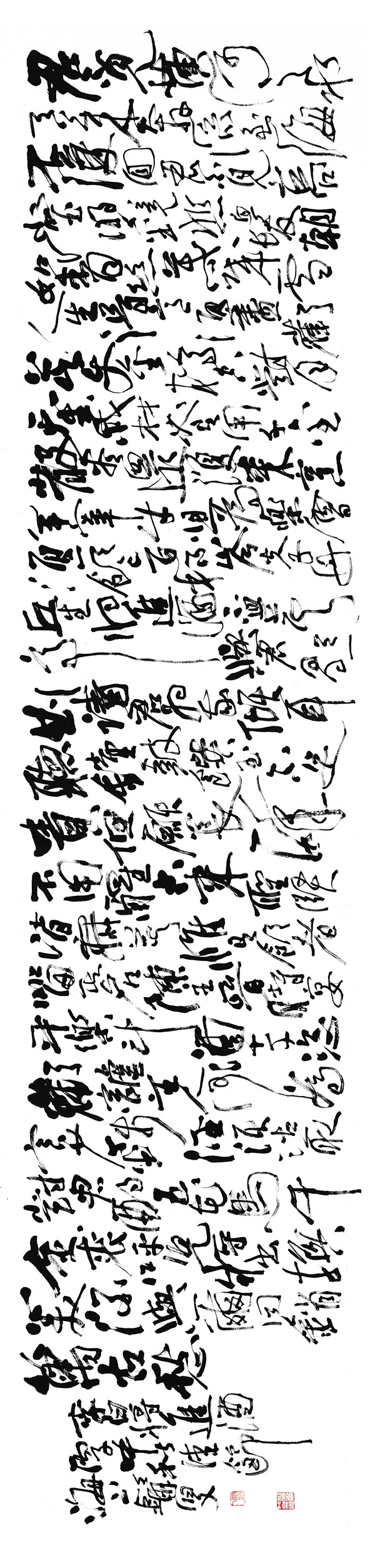 倪老晚年更加沉浸于大草,将一生不羁之创造力投入其中。他的大草大概可分为二类:一类线条粗犷,握管使锋落笔如暴风骤雨,章法弥满,时有涨墨如交响乐之重低音,使整个幅面构成更加跌宕起伏,如雷轰电激感心动目。另一类为游丝草,如轻音乐般地意动旋机,援毫掣动中锋行走炉火纯青,婉转自如清澈顺畅,氤氲飘渺以柔克刚。似清烟水墨,似天上游丝之云,给人时有天外之想。章法乱石铺路随其所应,点画与点画之间字与字之间镶嵌得天衣无缝节奏分明。如光明之镜界,这即是书仙凝炼成的清寂透澈的艺术境界。