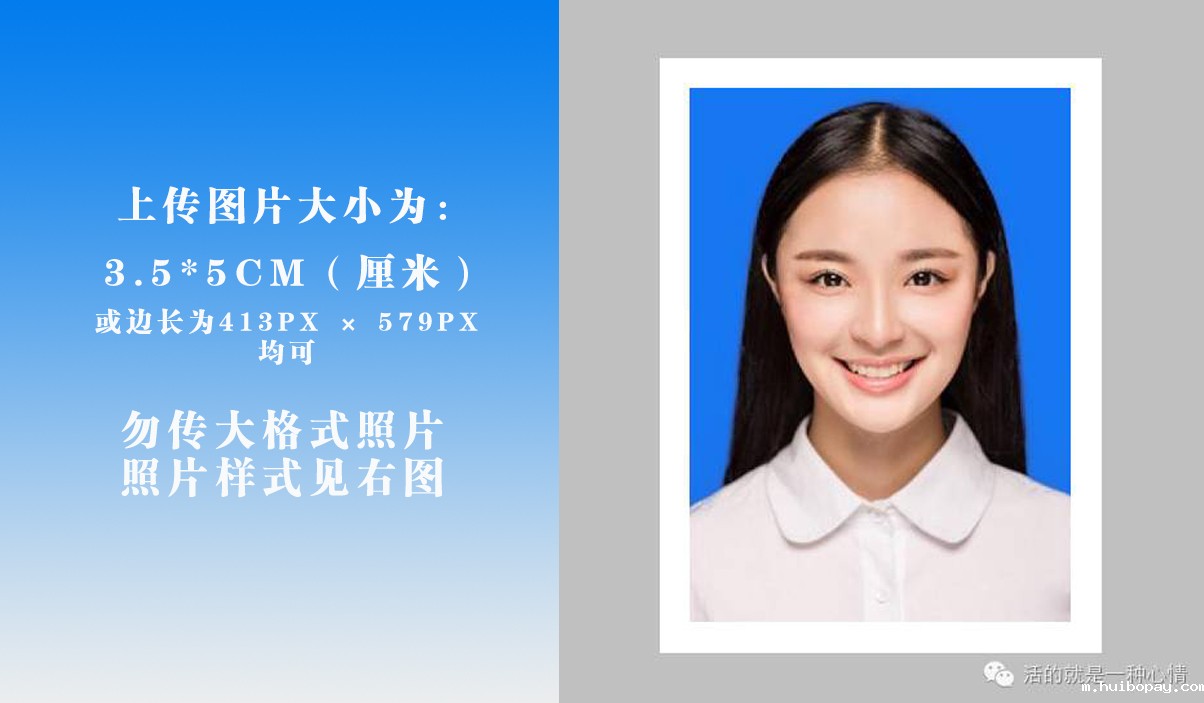 二、证件照片上传尺寸不超过35mm × 50mm或413px × 579px,尺寸太大上传不了系统,请注意调整上传尺寸;证件照标准如下图所示: