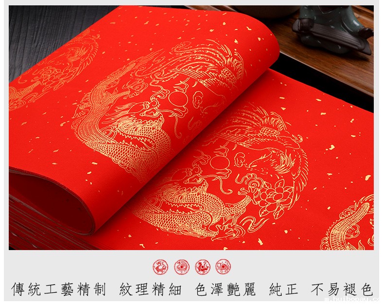 1. 万年红对联纸专用纸(龙凤洒金图案、五言、七言、九言、斗方等)