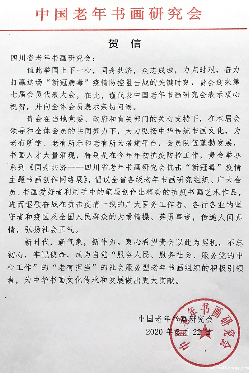 中国老年书画研究会,省政协原主席秦玉琴,省政协副主席王正荣,省民政厅厅长益西达瓦,省文联党组书记平志英,中国书法家协会顾问、四川省书法家协会名誉主席何应辉,四川省美术家协会主席梁时民,著名评论家马安信分别发来贺电、贺信,对大会的成功召开表示祝贺。四川省人民政府原副省长、四川省老年书画研究会原会长徐世群出席会议并讲话。