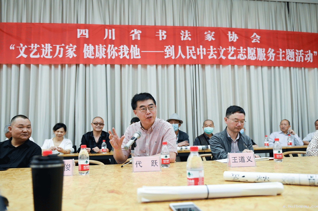 座谈会上,戴跃与老年作者们进行了倾心长谈。首先,他代表省书协向老年书法爱好者们长期以来对省书协工作的支持表示衷心的感谢,对他们长期以来坚持刻苦习练书法表示由衷敬意。他向老同志们介绍了四川省书协今年以来,在疫情期间书协所开展书法活动情况、5月26日在内江进行的四川省第七届篆刻艺术作品展评审情况,以及省书协举办首届老年书法篆刻展的筹备情况。他表示,省书协将在省文联的领导下,认真努力践行习近平新时代中国特色社会主义思想和党的十九大精神,坚持以人民为中心,深入基层、扎根人民,努力为我省老年书法家和书法爱好者搭建学习、交流、展示平台。其次,他鼓励老年同志们要放松心情,以平和的心态去看待展览。他说,按照联合国最新年龄段划分,大家都还年轻,大多数还属青年和中年人,构筑一种积极健康的生活态度,追求健康的生活方式是我们共同的目标。他的话引起了大家开心的笑声,氛围显得轻松而愉快。