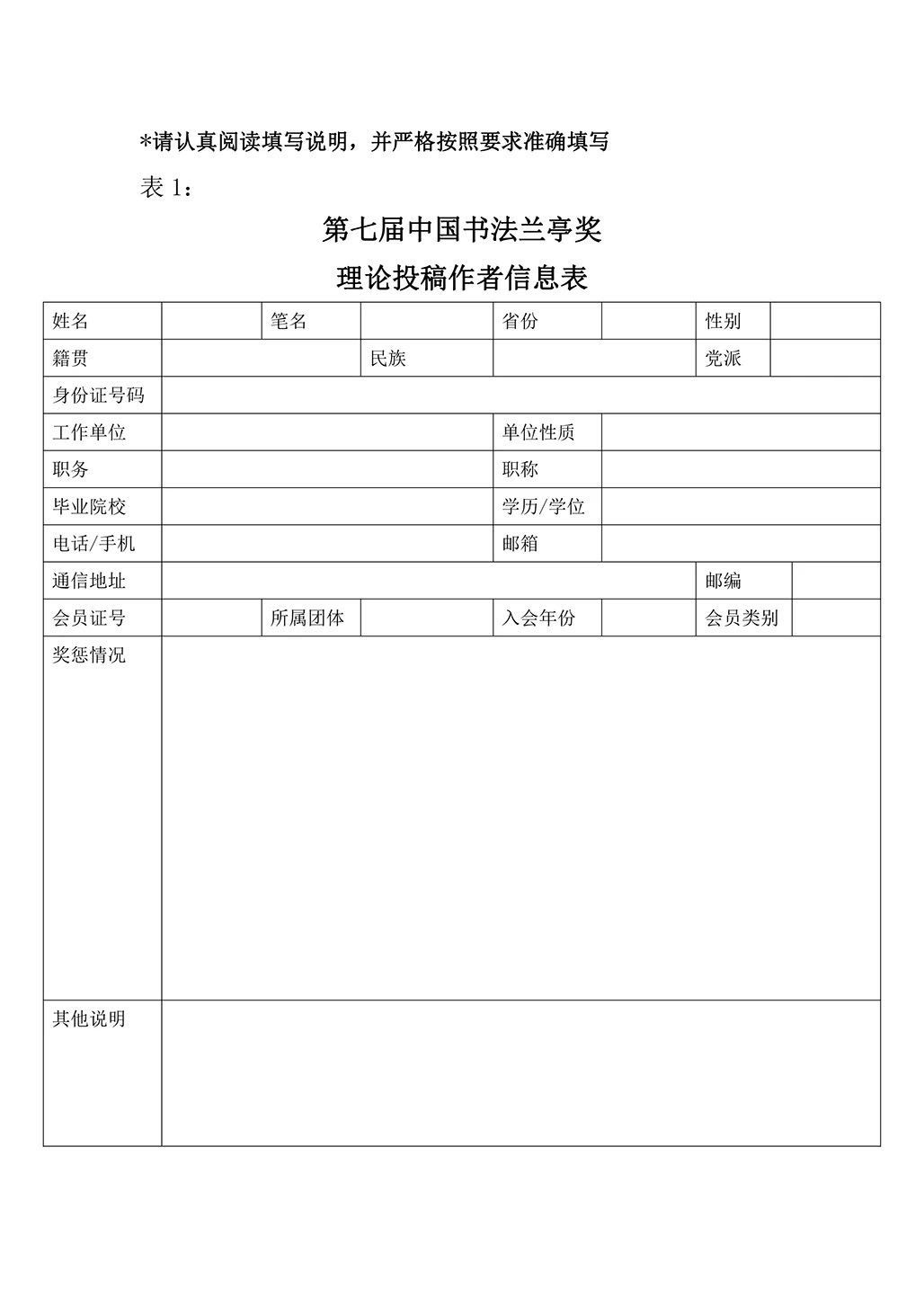 ③理论投稿作者须填写《参评著作、论文信息表》《书法理论成果表(中国书法家协会主办的论坛、讨论会等)》《书法理论成果表(非中国书法家协会主办的论坛、讨论会等)》《相关书法领域(书法理论以外)成果表》。