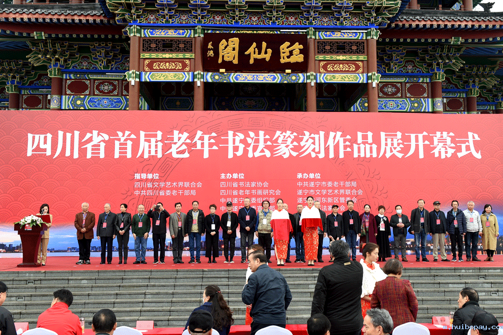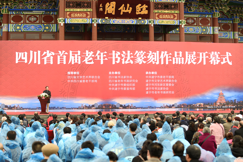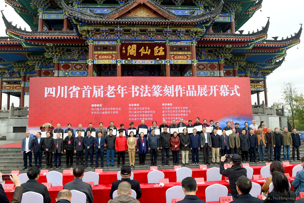 中国老年书画研究会常务副会长兼秘书长、国家文化部直属机关党委原常务副书记王吉,省首届老年书法篆刻作品展组委会主任、省政协原主席秦玉琴,省老年书画研究会原会长、省政府原副省长徐世群,四川省政协副主席王正荣,四川省老年书画研究会原第一副会长、省人大常委会原副主任李洪仁,四川省文学艺术界联合会党组书记、常务副主席平志英,四川省委老干部局二级巡视员刘亚冰,四川省文学艺术界联合会副主席、省书法家协会主席、中国书法家协会理事戴跃,四川省老年书画研究会会长、省委党史研究室原主任陈荣仲,香港特别行政区对外友好协会会长、香港文联常务副主席、四川省大熊猫国际文化艺术发展中心主任吴长江,四川省书法家协会顾问、省委老干部局原副局长、巡视员徐德松,中国书法家协会草书委员会委员、四川省书法家协会顾问何开鑫,四川省书法家协会顾问、省政府原副秘书长王七章,中国书法家协会理事、省书法家协会副主席钟显金,中国书法家协会行业建设委员会委员、省书法家协会副主席林峤,省老年书画研究会副会长,省商务厅原副厅长、巡视员李维民,省老年书画研究会副会长、原省丝绸公司副总经理戴朝先,原省农业厅厅长滕彩元,遂宁市委常委、组织部部长周鸿,遂宁市人大常委会党组副书记、副主任成斌,遂宁市政协副主席、市政府副秘书长、市扶贫开发局局长勾中进,遂宁市委原书记、市人大常委会原主任熊继尧,遂宁市老年书画研究会会长、市人大常委会原副主任赵洪武,遂宁市老年书画研究会原会长、市政协原副主席上官秀巍,遂宁市书协主席陈刚,四川省委老干部局、省书法家协会、省老年书画研究会相关领导、书法家代表,各市州委老干部局、书法家协会、老年书画研究会负责人和本届书法篆刻作品展荣获优秀奖作者代表,市委老干部局、市文学艺术界联合会、市河东新区管委会、市书法家协会、市老年书画研究会相关负责同志,市书法家协会、市老年书画研究会会员代表,市老年大学等及来自全省各地的书法爱好者1000余人参加开幕式并观看展览。