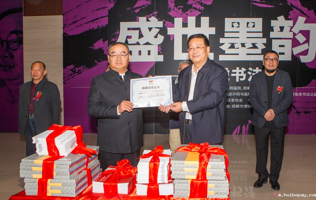 在开幕式上,封俊虎先生向邯郸市博物馆、图书馆捐赠了他主编的《张裕钊书法三帖》、《匠心之美——封俊虎书法作品集》和《俊虎墨妙》等文献书籍。邯郸市博物馆马小青馆长、图书馆祁向东馆长接受捐赠,并向封俊虎先生颁发了受赠证书。