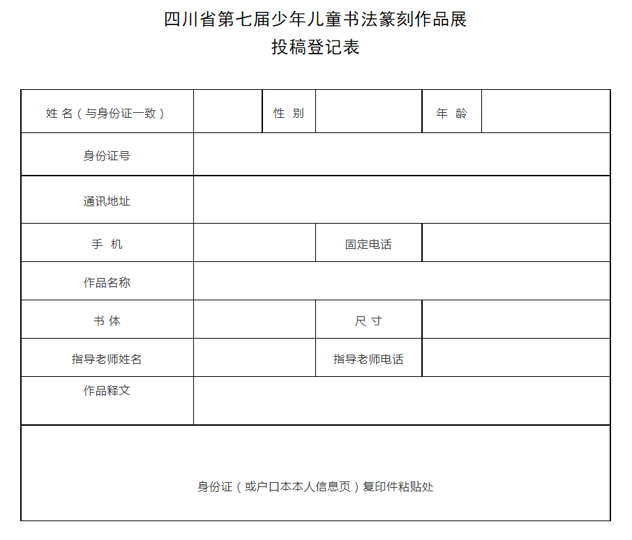 在作品背面右下方用2B铅笔正楷注明作者的姓名、性别、出生年月日、通讯地址、联系电话以及指导教师姓名,并认真填写《四川省第七届少年儿童书法篆刻作品展投稿登记表》,该表随作品一并寄出或报送。所有作品限于人力,一律不退稿。