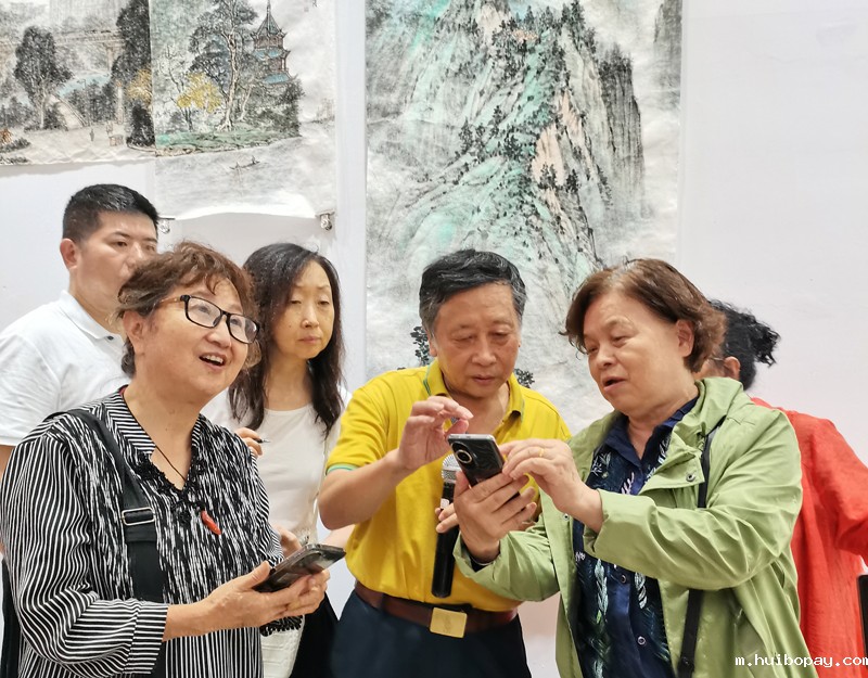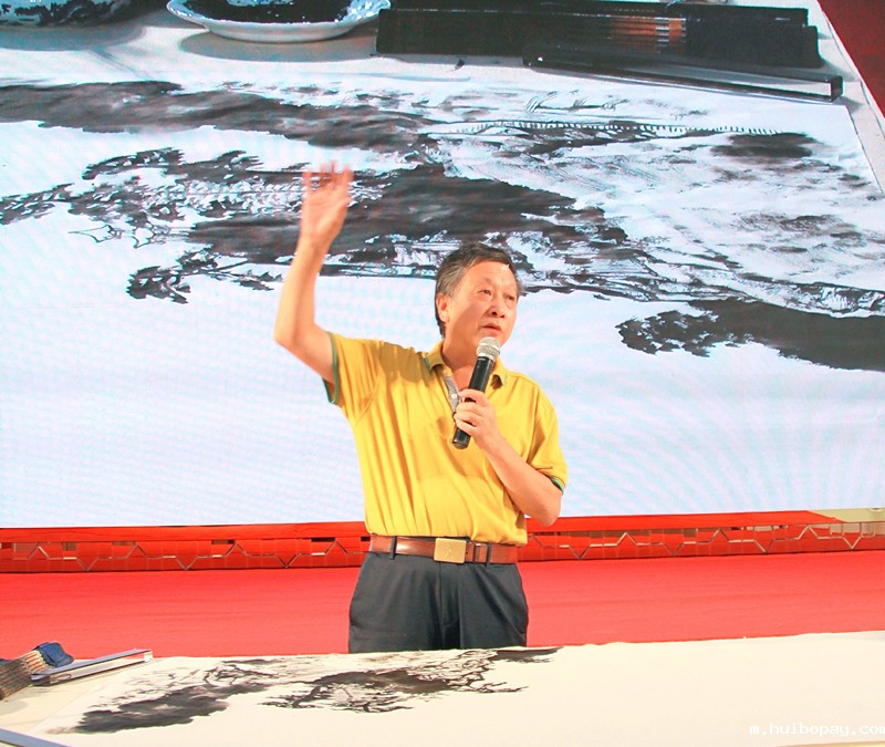 讲座分成两部分:山水画的画法和题款。姚叶红左手握话筒,右手执画笔,站在一张整六尺宣纸前激情讲座。他的身后是硕大的直播投屏,他绘画的一横一竖、一招一式都让现场和千里之外的观众尽收眼底。