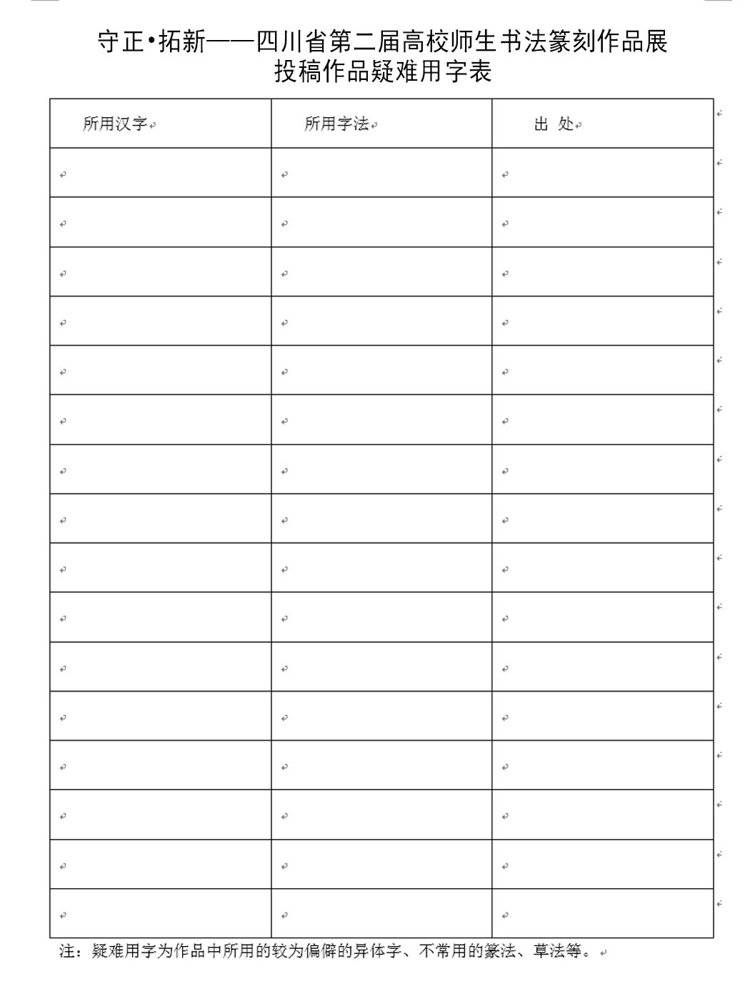 3.为便于准确登记,及时联系投稿作者,务请认真填写《四川省第二届高校师生书法篆刻作品展投稿登记表》《四川省第二届高校师生书法篆刻作品展投稿作品疑难用字表》(后附表格,可复印使用,也可从四川师范大学美术学院﹒书法学院网站www.http://finearts.sicnu.edu.cn/下载),连同身份证复印件、作品及所附释文和书写内容使用的权威版本复印件,一并寄出。