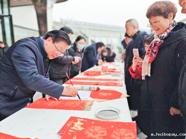 陈广仁主席表示,大千故里,龙腾盛世,内江市书协围绕市委市政府中心大局,大力开展书法主题展览和文化惠民活动。今天卓尔百货公司董事长李洋兵、财务总监刘志斌亲自上阵,不仅提供物资支持,维护现场秩序,热情接待每位顾客,深受老百姓欢迎。书法家们饱蘸浓墨,现场共书写福字600余幅,春联500余幅。(内江市书协)