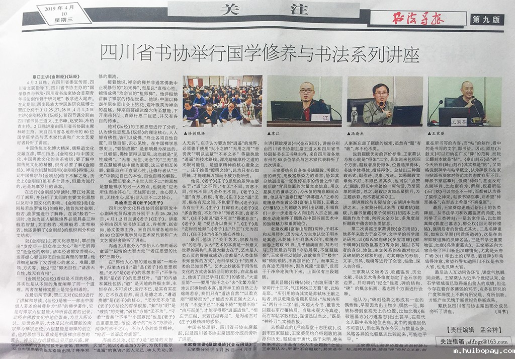 2019年4月10日,《书法导报》刊登“国学修养与书法•四川省书法家协会首期青年创作骨干研习班”消息