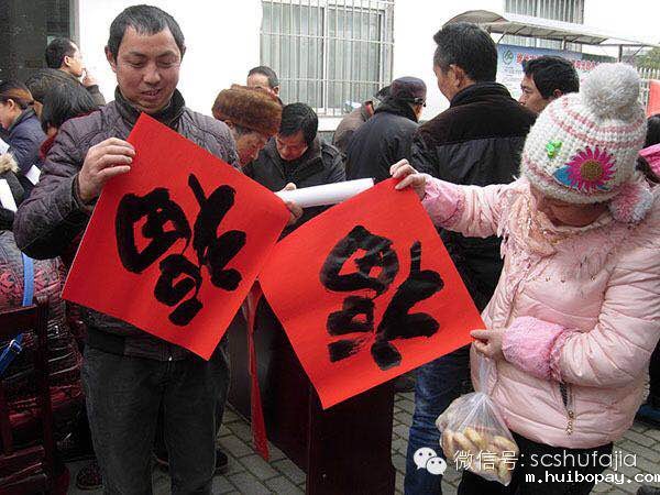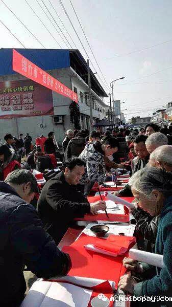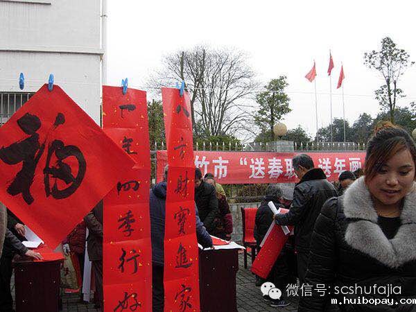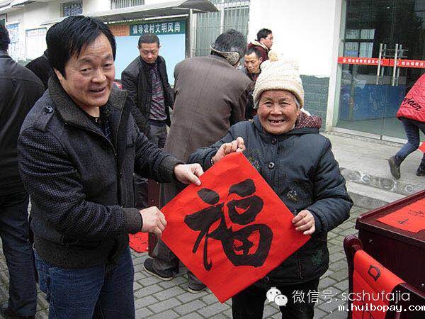 这是一场别开生面的文化惠民活动。写春联,送福字是绵竹市书协多年来坚持的一项群众文化活动内容,书法家们用手中的笔墨表达了对全镇人民的深深祝福。广场上人来人往,好不热闹。 “丁老师,请帮我写幅春联。”“老师,请你再帮我写幅堂屋门的春联。”“老师,请你也帮我写个‘福’字”……书写现场,绵竹市的20多位书法家们与书协主席丁小虎一起,忙不停的为广大群众书写春联和“福”字。钟大伯双手手捧所送的大红“福”字和对联,激动地说:“书法家们真好,连对联和福字也给我们送到家门口了!“