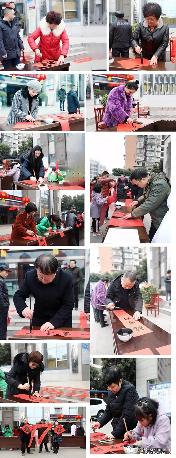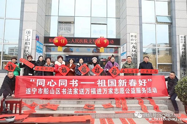 人逢盛世精神爽,年庚岁末送春联。红红火火的春联表达美好愿望、希望,使新年有个新气象,在鼠年春节来临之际,遂宁市船山区书法家协会到龙凤镇中心卫生院开展“同心同书——祖国新春好”送万福进万家志愿公益服务活动,弘扬传统美德,传递爱心,把社会各界的关怀和祝福送到千家万户,营造节日喜庆。
