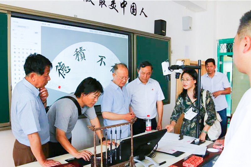 会后,书法家们参观了学校,在“数字书法教室”,金玉全、曾光福等书法家饶有兴致地观看了老师的操作:在遵循传统笔墨纸砚书法教学的前提下,引入数字信息化技术手段,实现了“让书法名家走进课堂”与“一对一教学”,使教学反馈更及时,教学效果更显著。