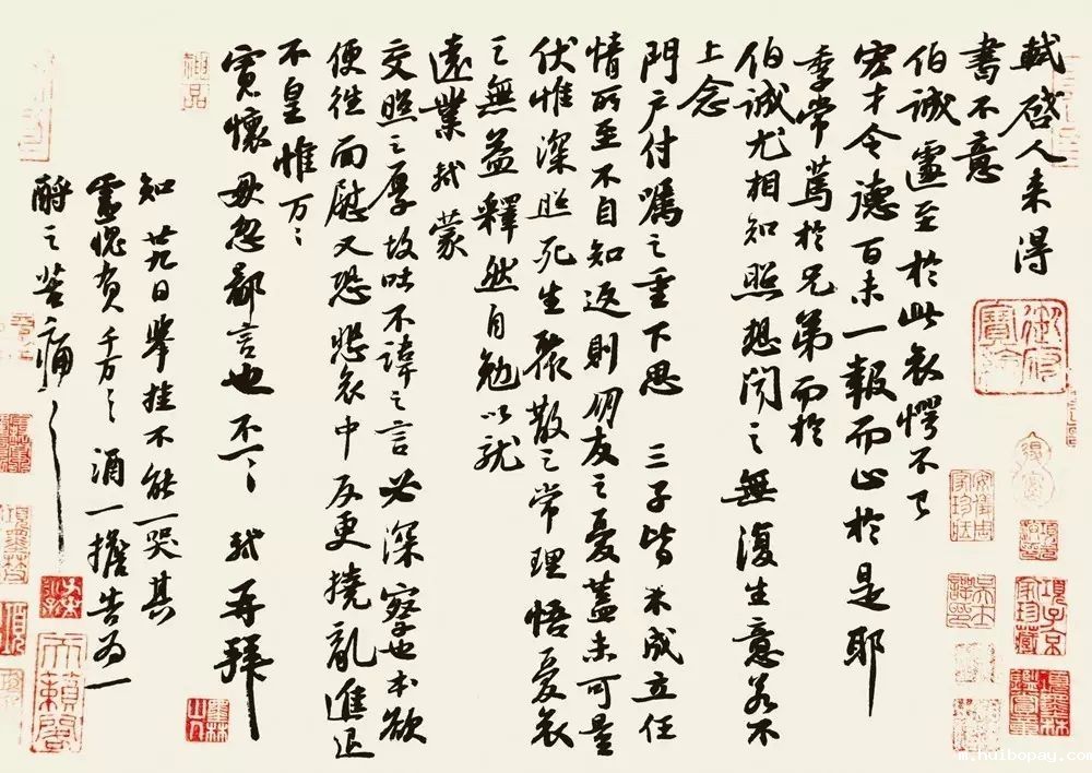 从《人来得书帖》的内容可知,这是一封苏轼写给陈季常的信札。因为陈季常之兄陈伯诚过世,苏轼作此书信借以慰问,并在信中叙述了其与伯诚的交情,表达了对旧友过世的痛惜与哀悼。从书法创作的技法层面来看,《人来得书帖》的精妙之处难以形容。苏轼书法特有的潇洒、遒劲贯穿在整帖的字里行间,笔势有起承转合之势,毫不拘束,直抒胸臆。明代书法家、鉴赏家董其昌认为:“东坡真迹余所见无虑数十卷,皆宋人双钩廓填。坡书本浓,既经填墨,益不免‘墨猪’之论。唯此二帖则杜老所谓‘须臾九重真龙出,一洗万古凡马空’也。”董氏认为《人来得书帖》与《新岁展庆帖》代表了苏轼在行书上取得的成就。《人来得书帖》全帖用墨浓重,结体虽密却清晰可辨,也体现了苏轼书法较为肥厚的特点。苏轼行书结字多偏扁而斜,单个字体十分耐看且结体颇具韵味。例如此帖中的“启”“诚”“照”“念”等字,苏轼故意将结体压扁,制造出一种视觉上的紧凑感;但入笔劲道,虽不秀丽却显得精妙十足。苏轼的书法崇尚率真。在《人来得书帖》全篇书写中,率性之处也随时可见。如“启”“是”“思”“死”“哀”“无”等字,从笔尖流露出的笔势姿态收放自然,特别是收尾处能够让人体会出一种欲言又止的妙趣。再如“此”“闻”“以”“反”等字,映带部分的处理亦十分打动人心。此帖在书写过程中,随着作者个人情感的不断强化,原本工整的行书在过半的位置书写速度开始加快,以至于在末尾处,作者因痛惜的心情,将哀悼的情感转化成笔尖的情绪。此处笔迹虽显荒率,但却是情感所致,也体现了书家对书法的一种深入理解。